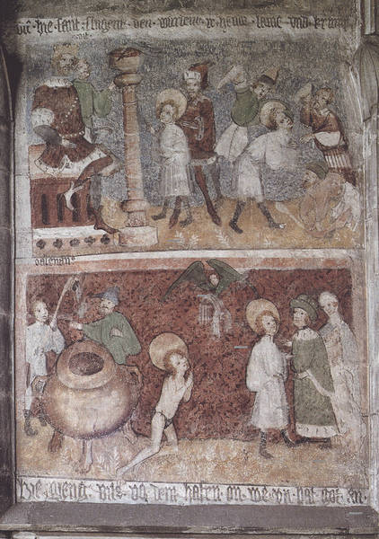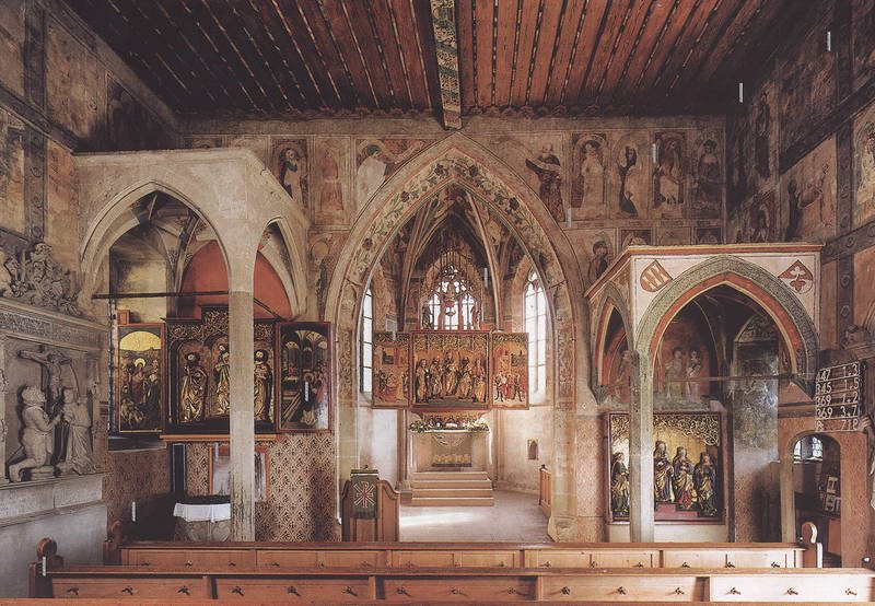 1380 durch Reinhard von Mühlhausen gestiftet. Durch Prager Künstler ausgestattet bzw. ausgemalt, stellt der Bau ein qualitätvolles und in Württemberg seltenes Beispiel gotischer Ausstattungskunst dar. Die ältesten Wandmalereien um 1385 im Kirchenschiff auf der Triumphbogenwand: oben Propheten, unten Credo-Apostel. Danach zeitlich folgend die Darstellungen im Chorgewölbe: u.a. thronender Christus und Maria, Evangelisten und Kirchenväter. Chorseite des Triumphbogens: Jüngstes Gericht, flankiert von einer Schutzmantelmadonna und von Petrus, der die Seligen ins Paradies einlässt. An den Chorwänden: Legende des hl. Veit, dat. 1428 mit zwölf zum Teil beschrifteten Bildern.