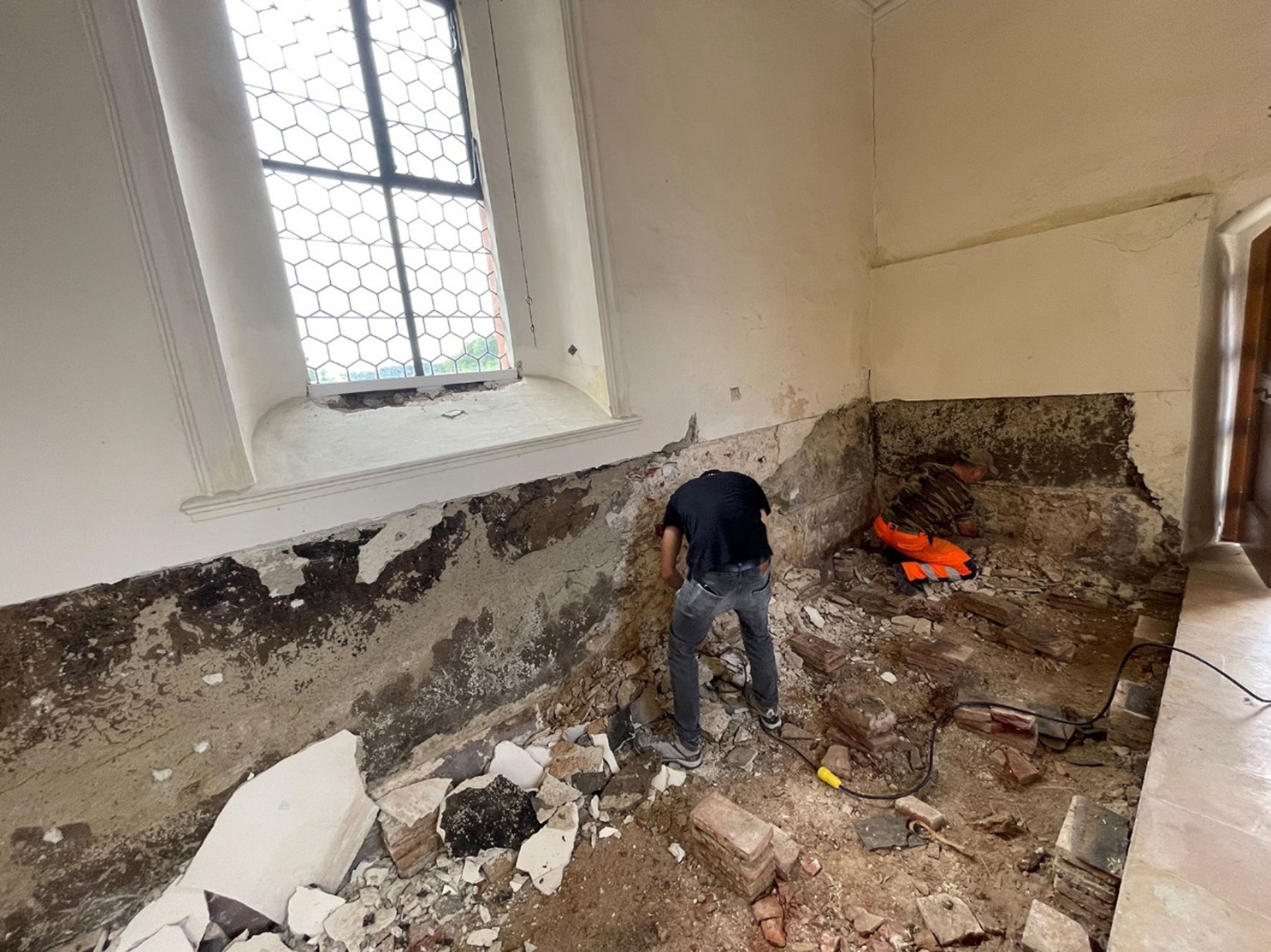 In den unteren Wandzonen zeichneten sich Schäden durch aufsteigende Feuchtigkeit ab, was wohl auch geografisch bedingt ein Dauerproblem darstellt und immer bleiben wird.