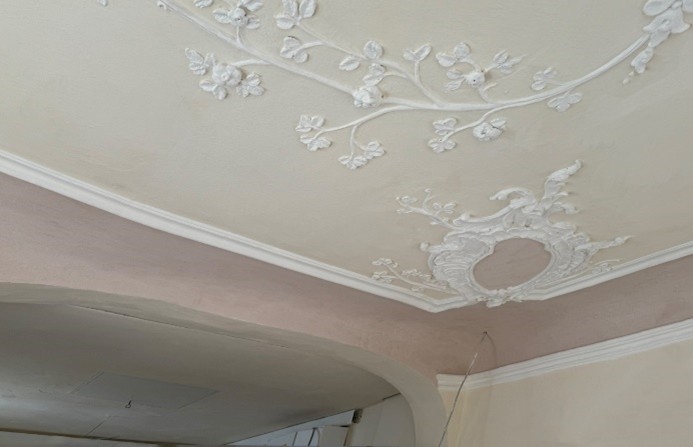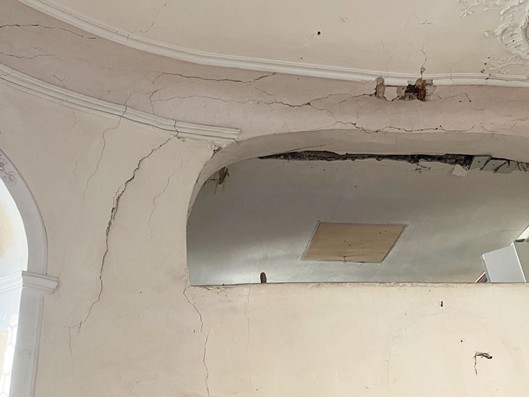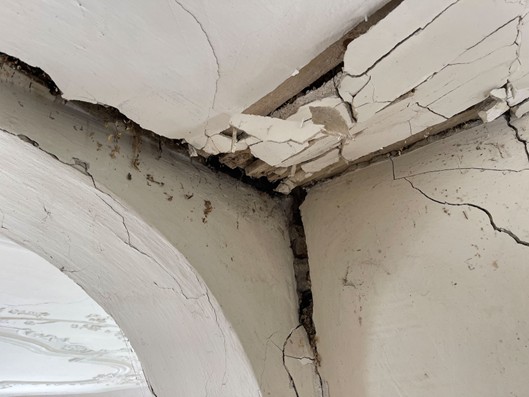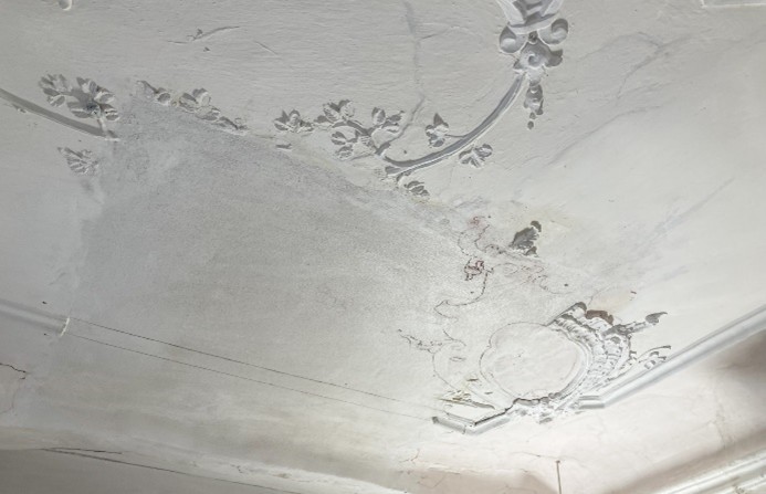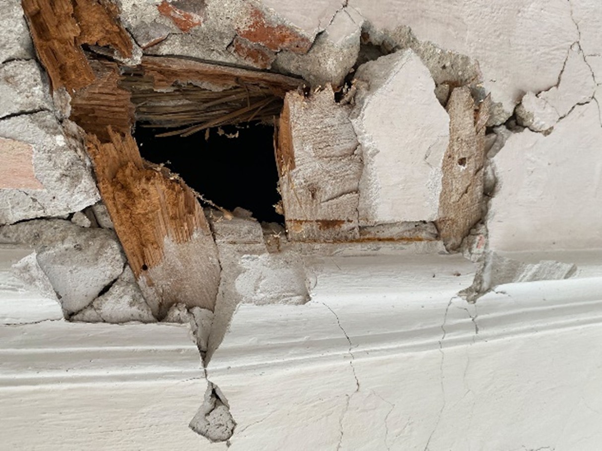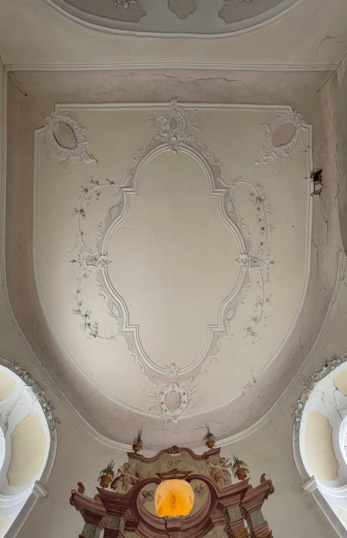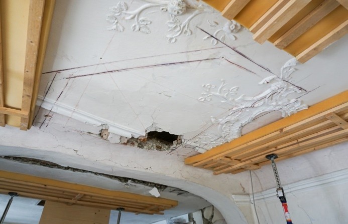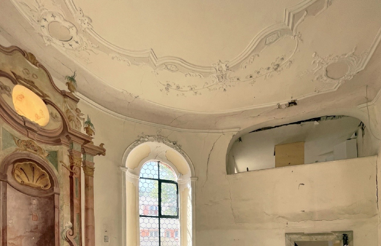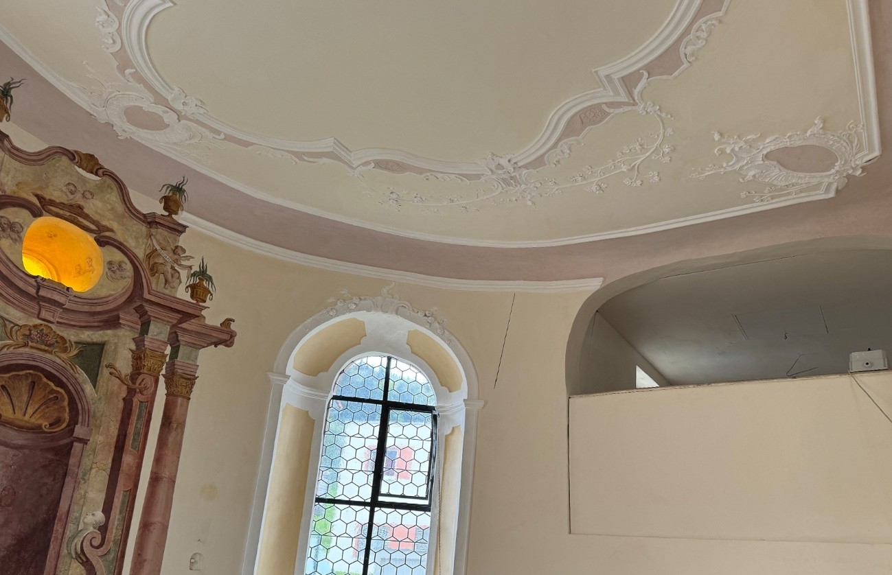 Zu diesen Schäden kam noch ein weiterer, durch eingedrungenes Regenwasser verursachter Schaden an der Chordecke.