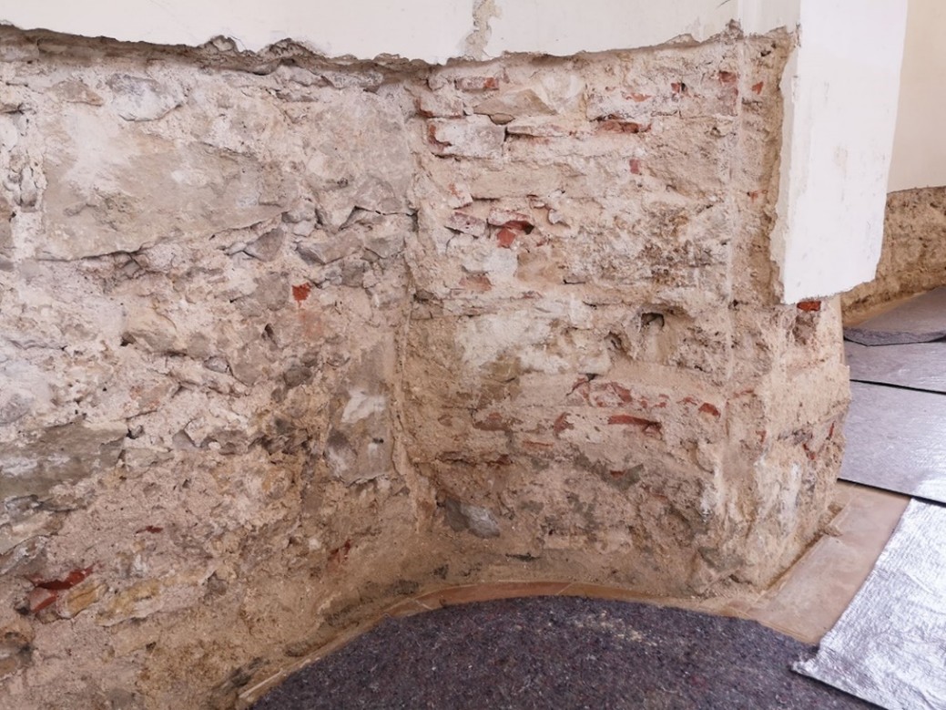 Im Chor und in der Sakristei lag eine andere Situation vor. Die Schäden sind hier geringer, weshalb der Verputz hier lediglich bis ca. 30-40 cm über dem Boden abgenommen wurden musste.